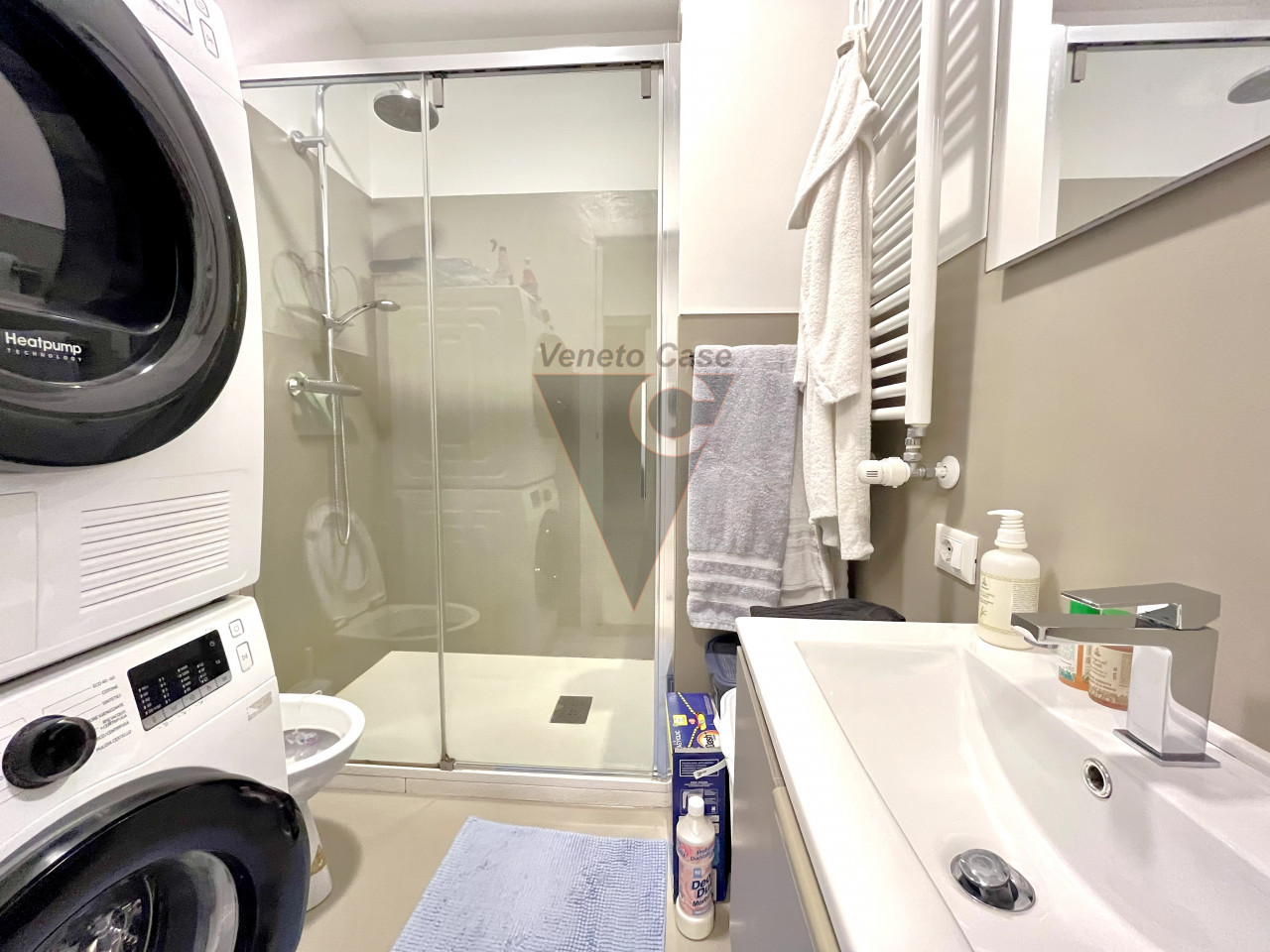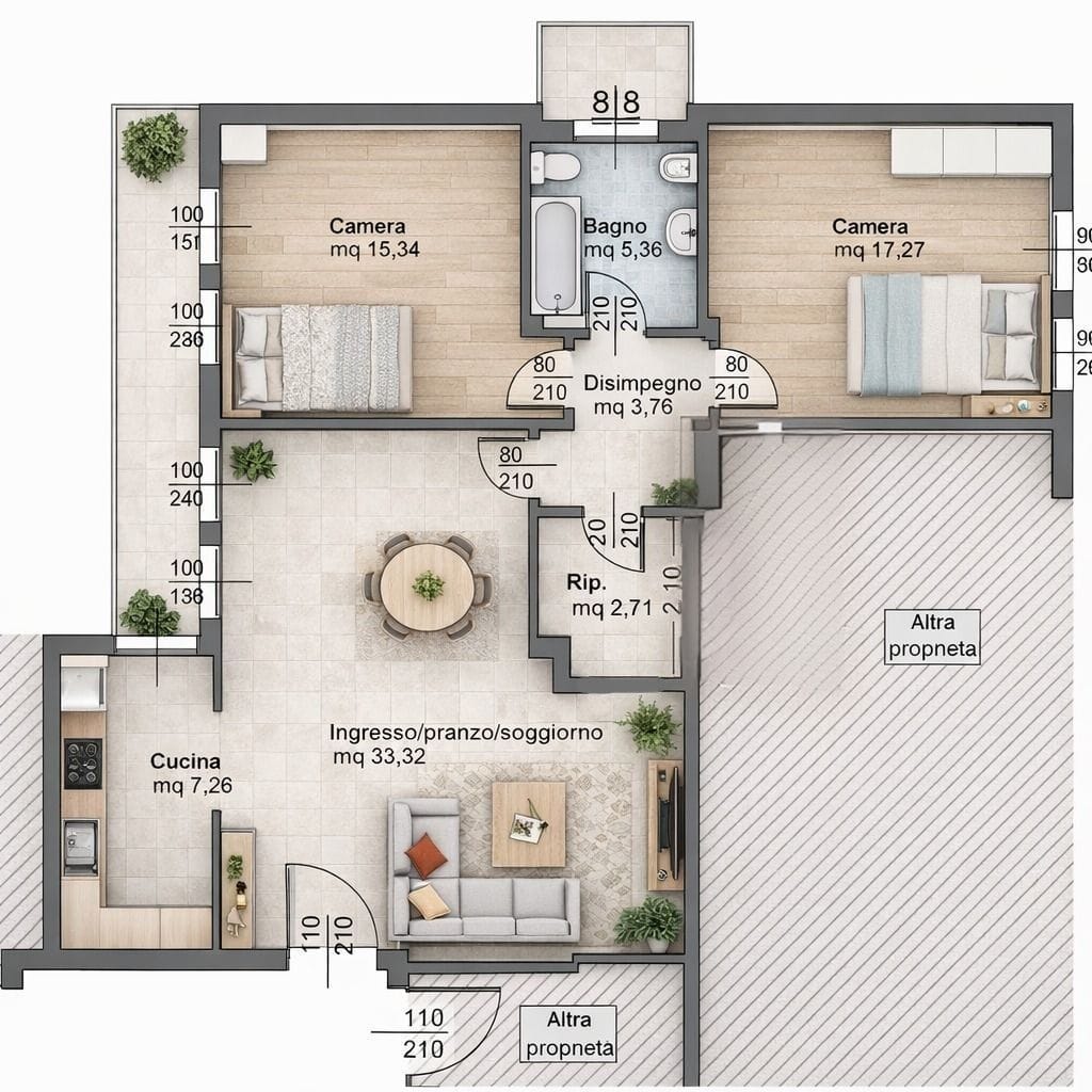 A completare la soluzione due bagni: uno cieco servito da box doccia e uno finestrato servito da vasca da bagno idromassaggio e accesso al secondo poggiolo.