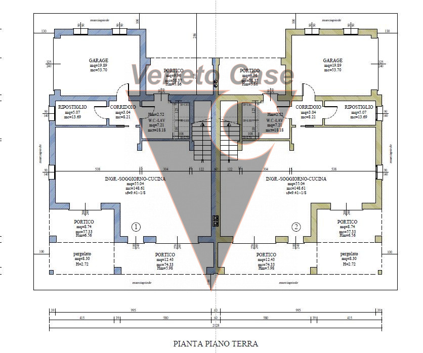 L’ immobile si sviluppa su due livelli; il piano terra è composto da un ampio soggiorno-cucina, ripostiglio, bagno-lavanderia, un garage e due portici.
