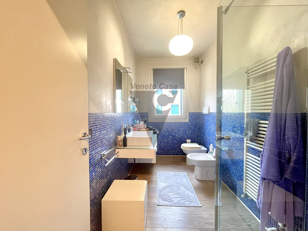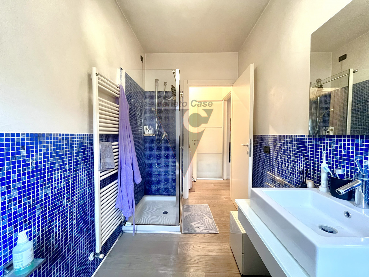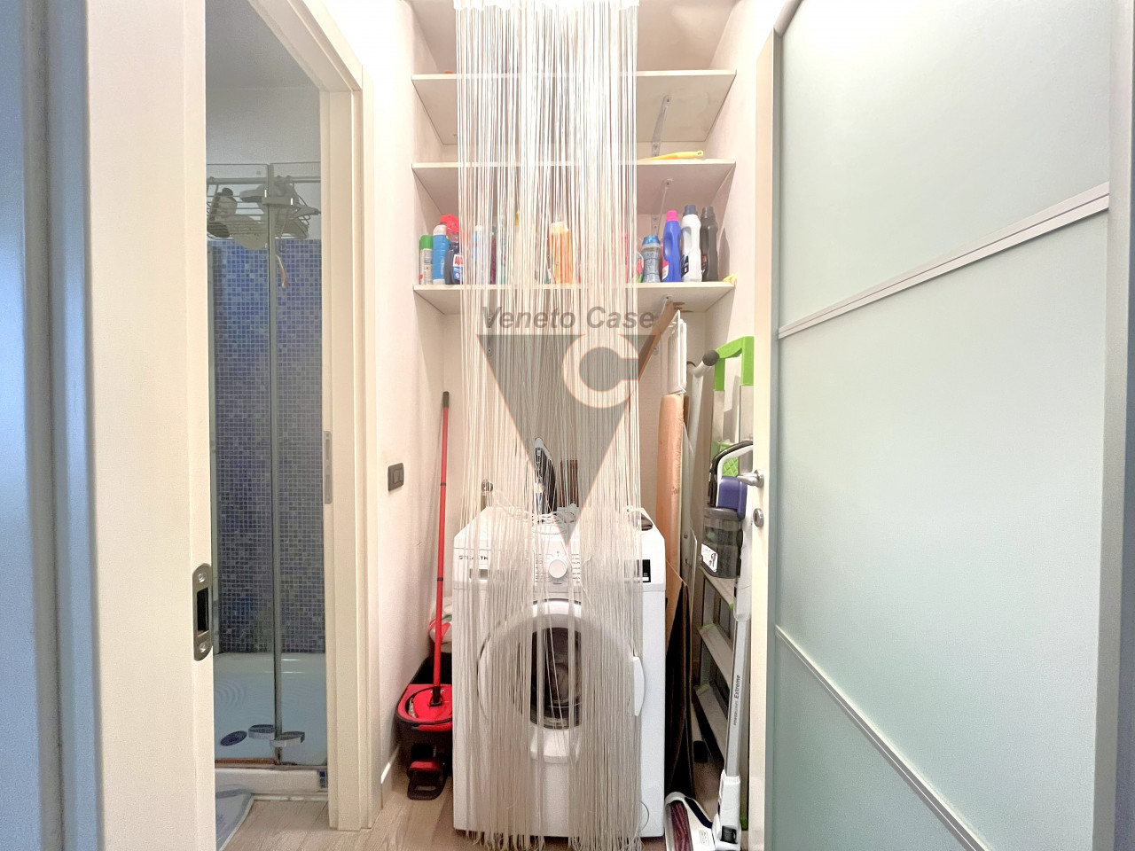 Il disimpegno con una nicchia che funge da lavanderia ci conduce al primo bagno finestrato servito da box doccia.