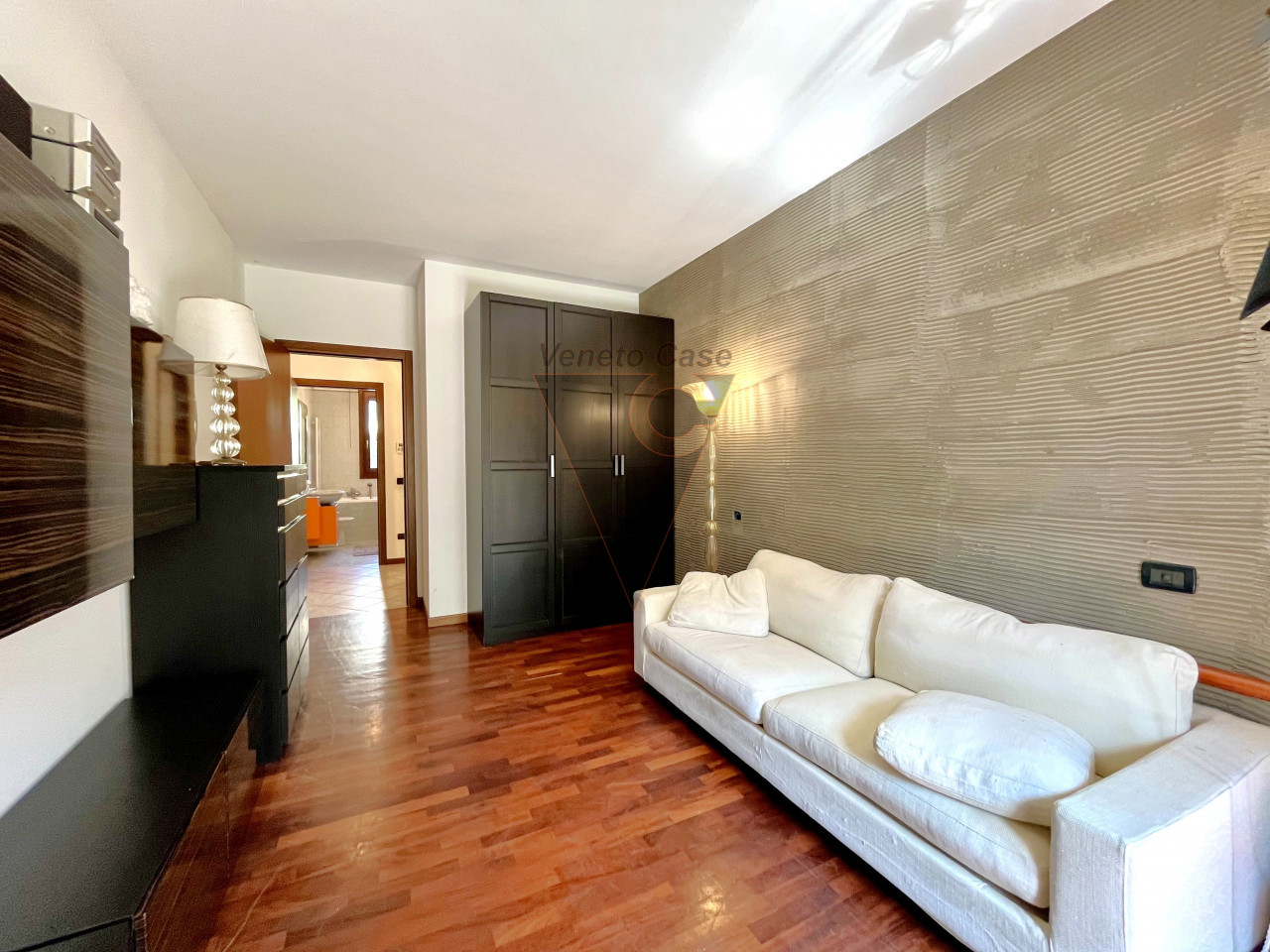 Dal disimpegno accediamo alla zona notte composta da una camera da letto matrimoniale servita anch’essa dal secondo giardino privato e un bagno finestrato servito sia da box doccia che da vasca da bagno.