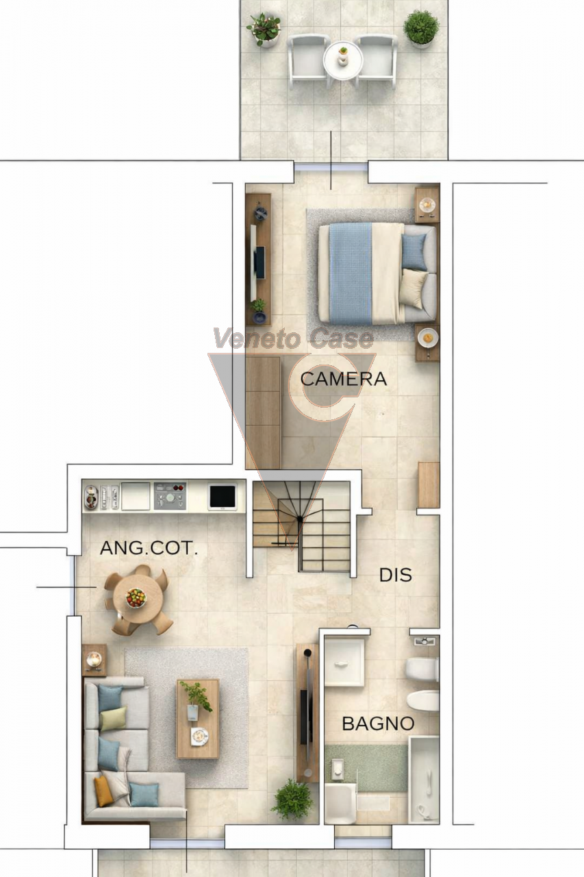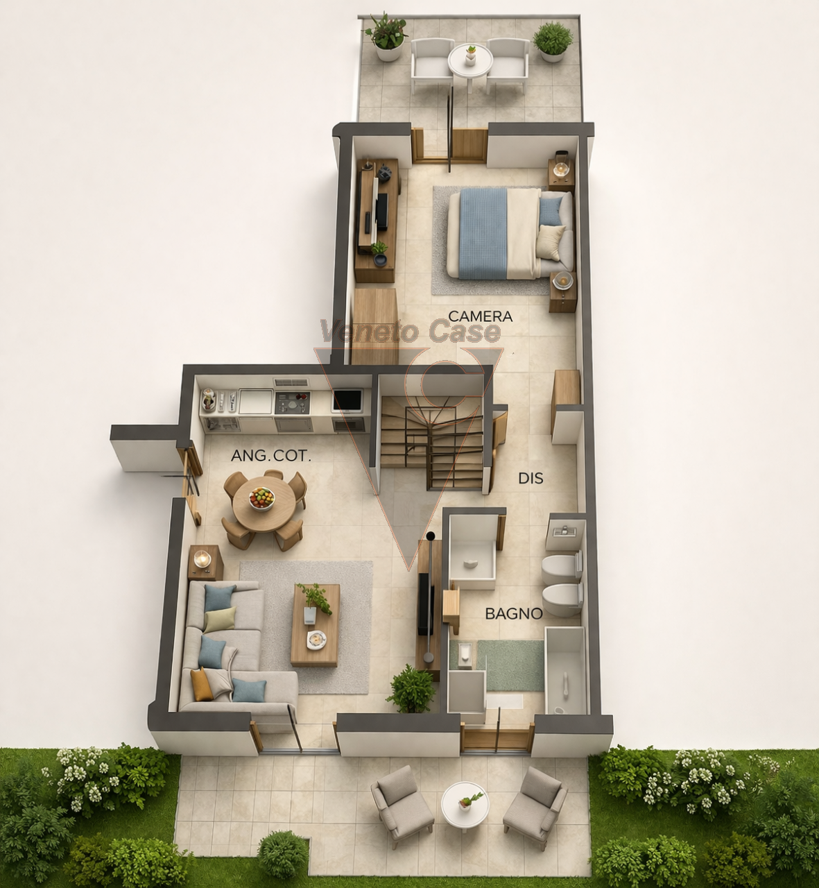 La soluzione si sviluppa al piano terra ed è composta dalla zona giorno open space con angolo cottura e ampia porta finestra che ci conduce al primo giardino privato.