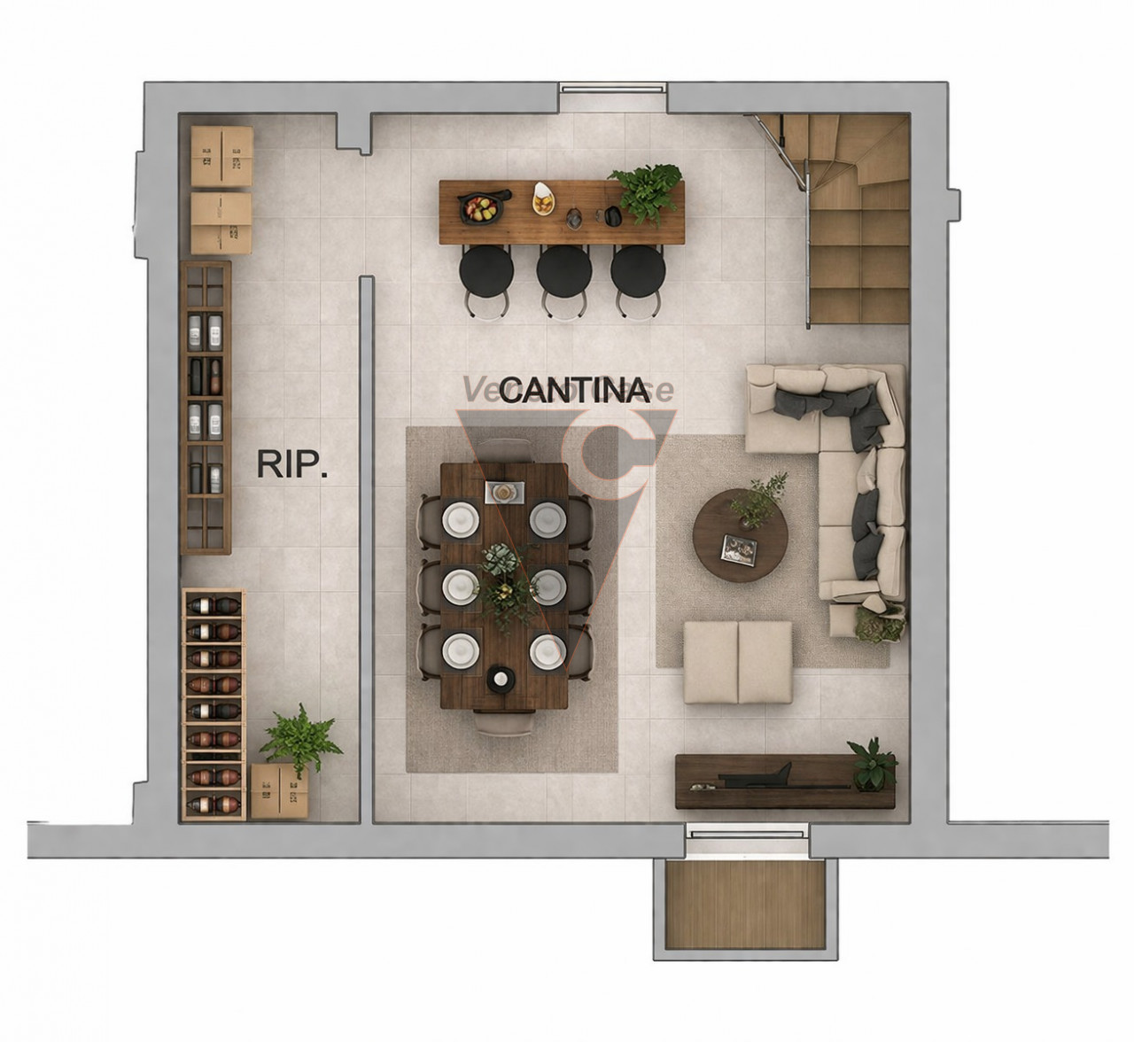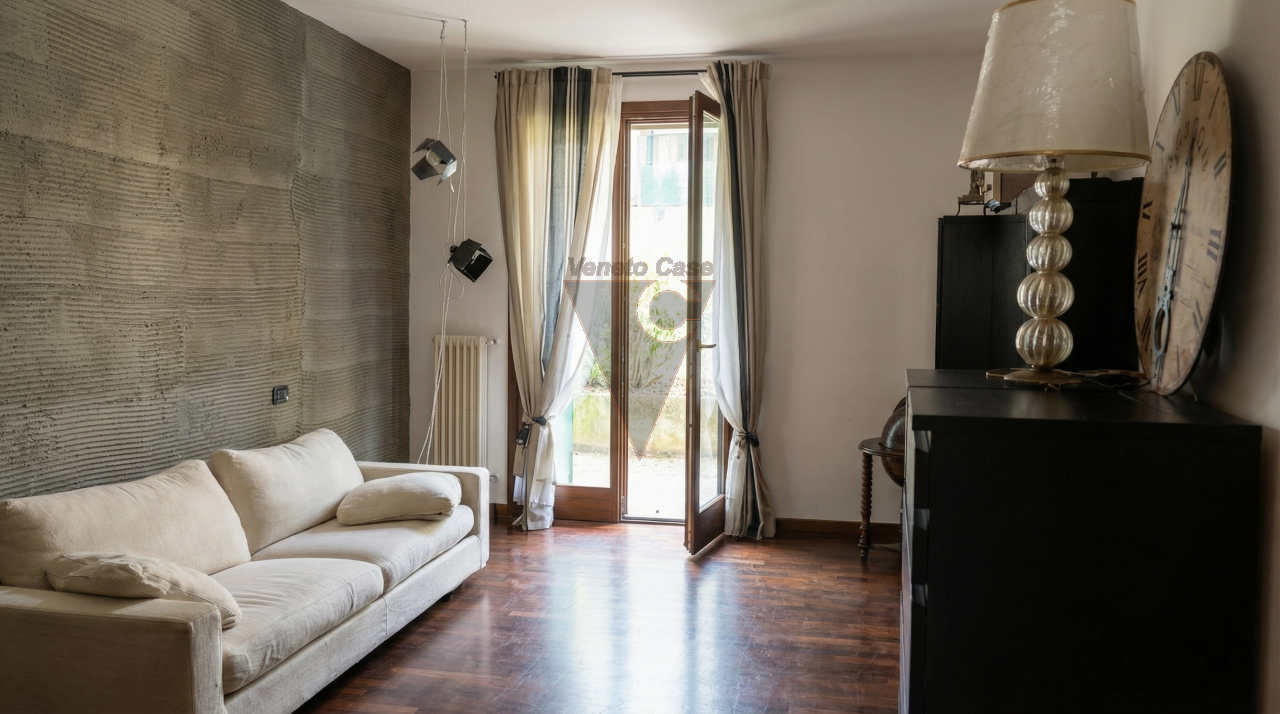 La soluzione si sviluppa al piano terra ed è composta dalla zona giorno open space con angolo cottura e ampia porta finestra che ci conduce al primo giardino privato.
