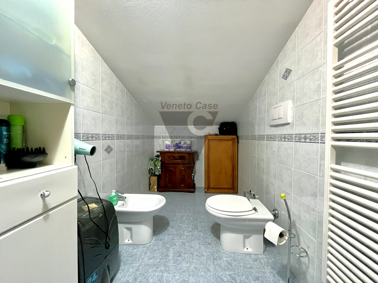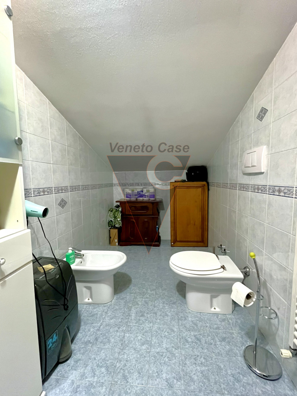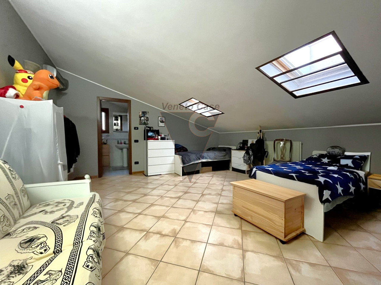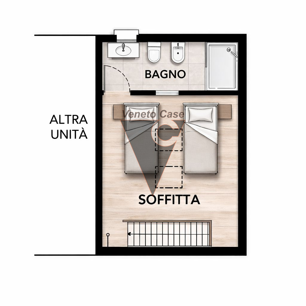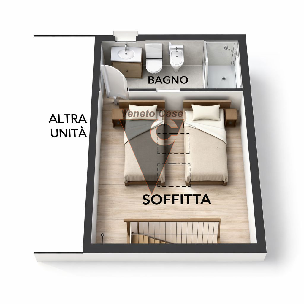 Dalla zona giorno accediamo al piano superiore dove troviamo una seconda camera matrimoniale mansardata e un ulteriore bagno finestrato servito da box doccia.