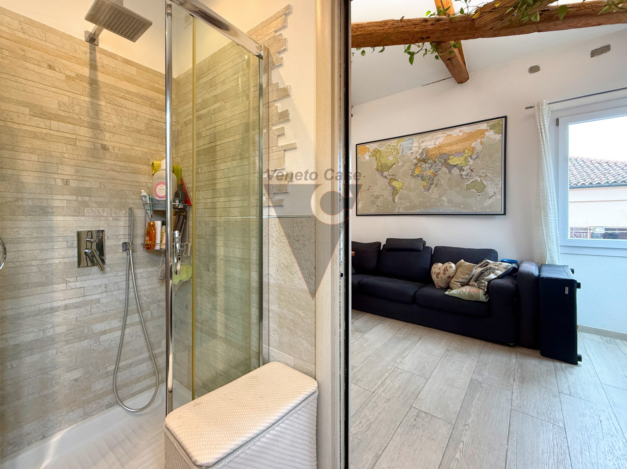 A valorizzare ulteriormente la proprietà troviamo una soffitta di pertinenza. Nel sottotetto è già presente un abbaino sulla falda ad est, elemento architettonico di grande interesse: questa caratteristica rappresenta un presupposto concreto per la possibile realizzazione di un’altana di proprietà, soluzione esclusiva che permetterebbe di godere di uno spazio esterno privato con vista sui tetti veneziani e luce naturale nelle prime ore del giorno (previa verifica tecnica e autorizzativa).