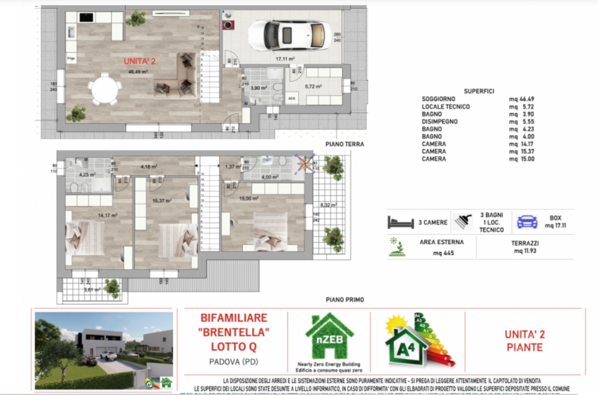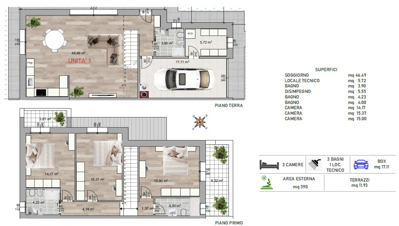 Distribuite su soli 2 piani, dispongono di luminosa zona giorno di 47mq con affaccio sull’ampio giardino di circa 400mq, di 3 spaziose camere da letto e di 3 bagni.
