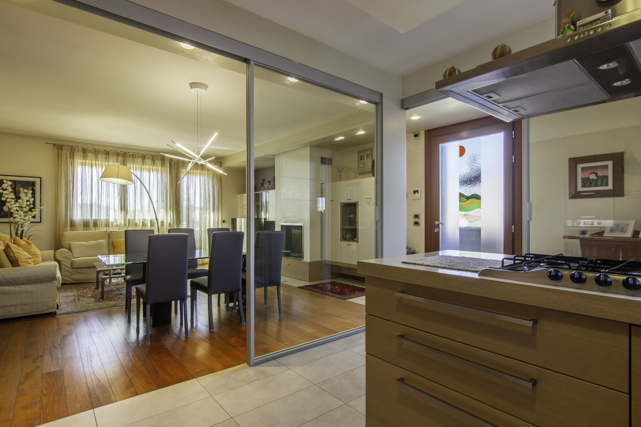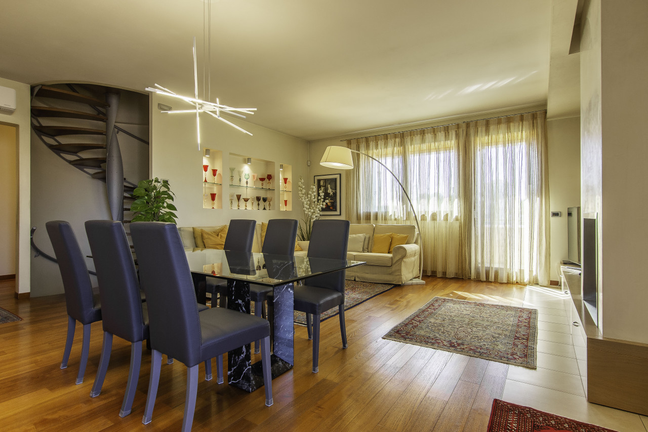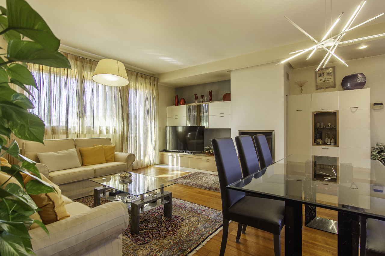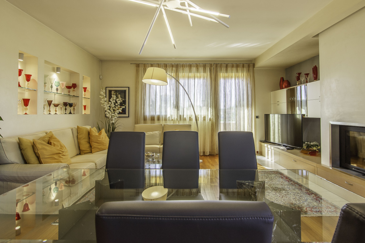 Finiture di pregio: pavimenti in legno e marmo naturale, porte interne laccate, serramenti in legno/alluminio ad alte prestazioni, illuminazione di design e dettagli artigianali di grande valore.