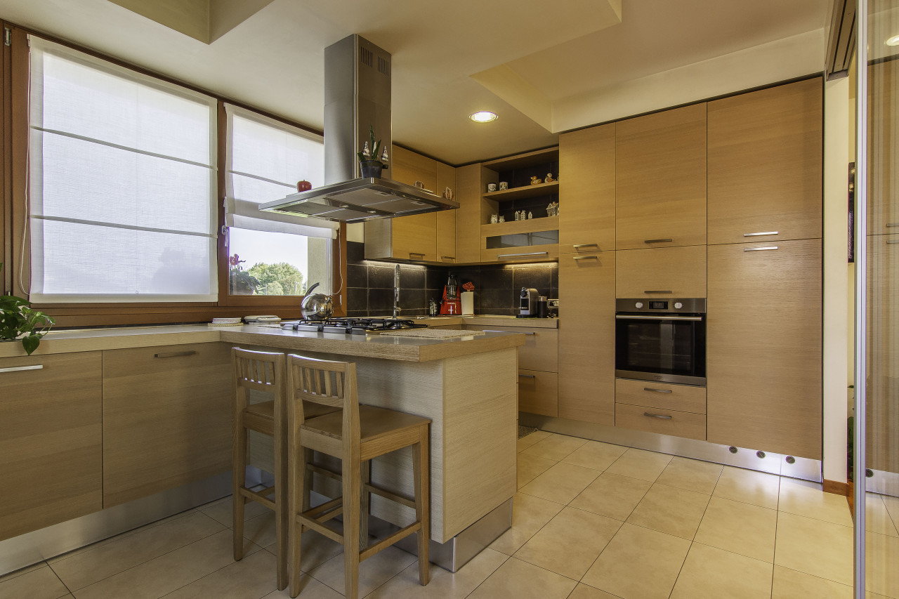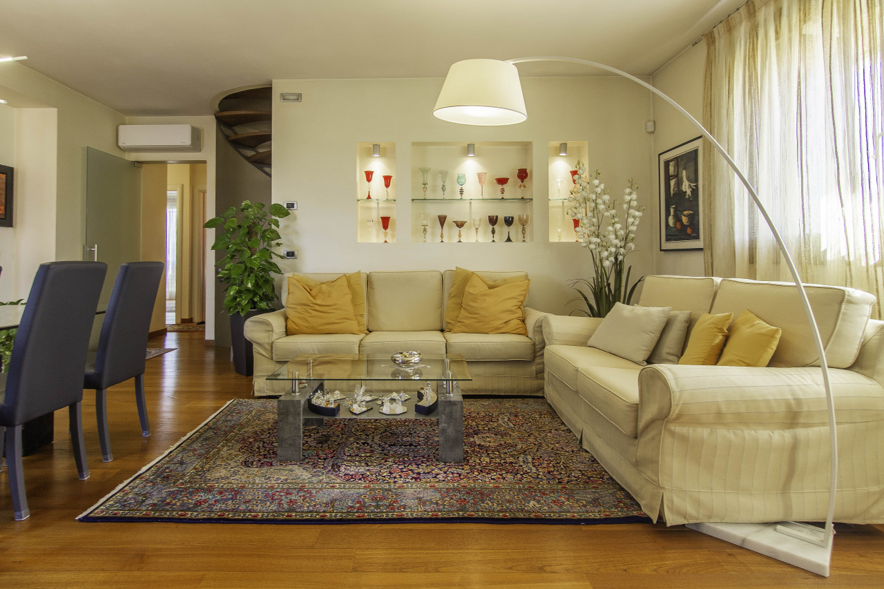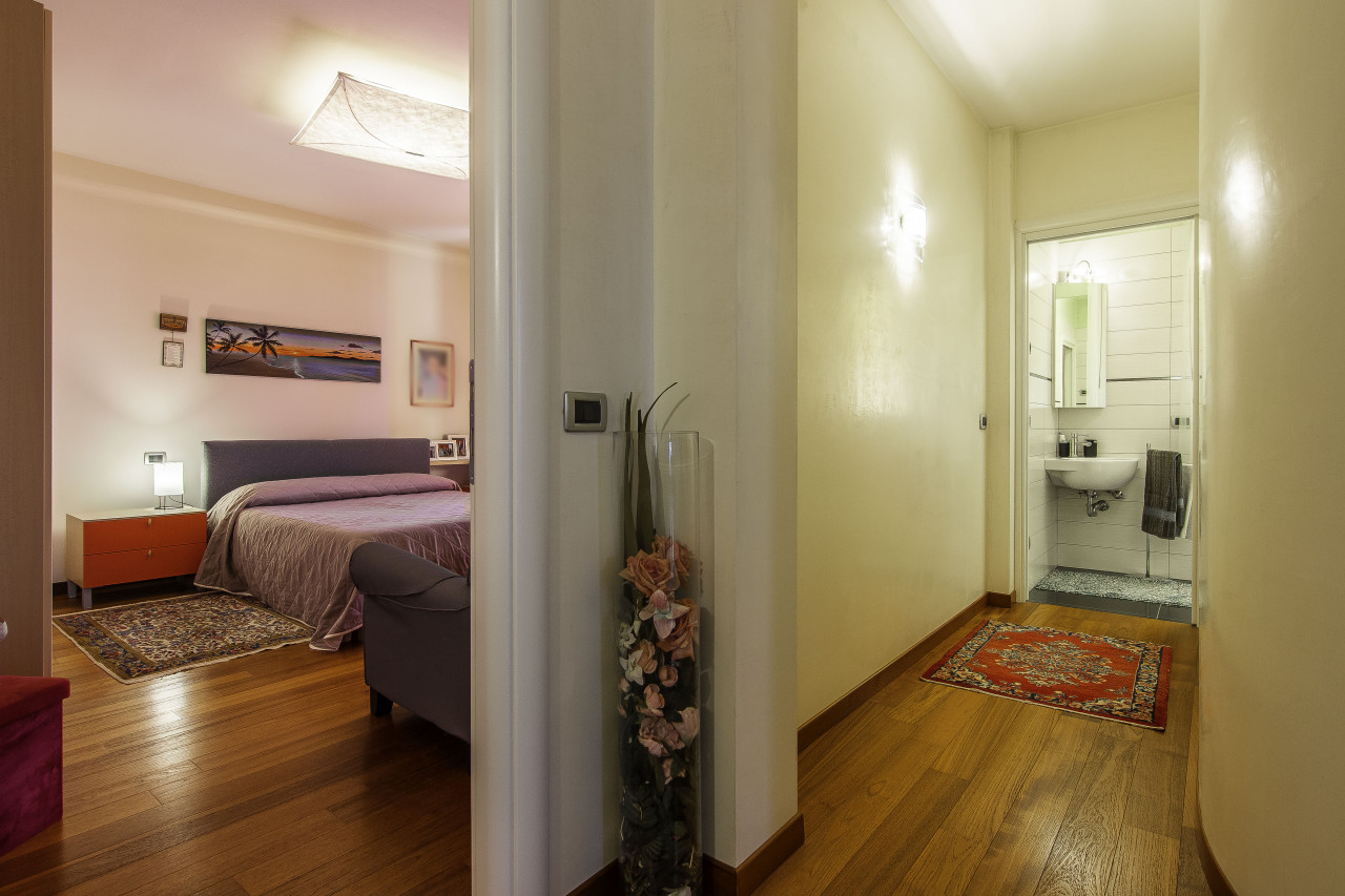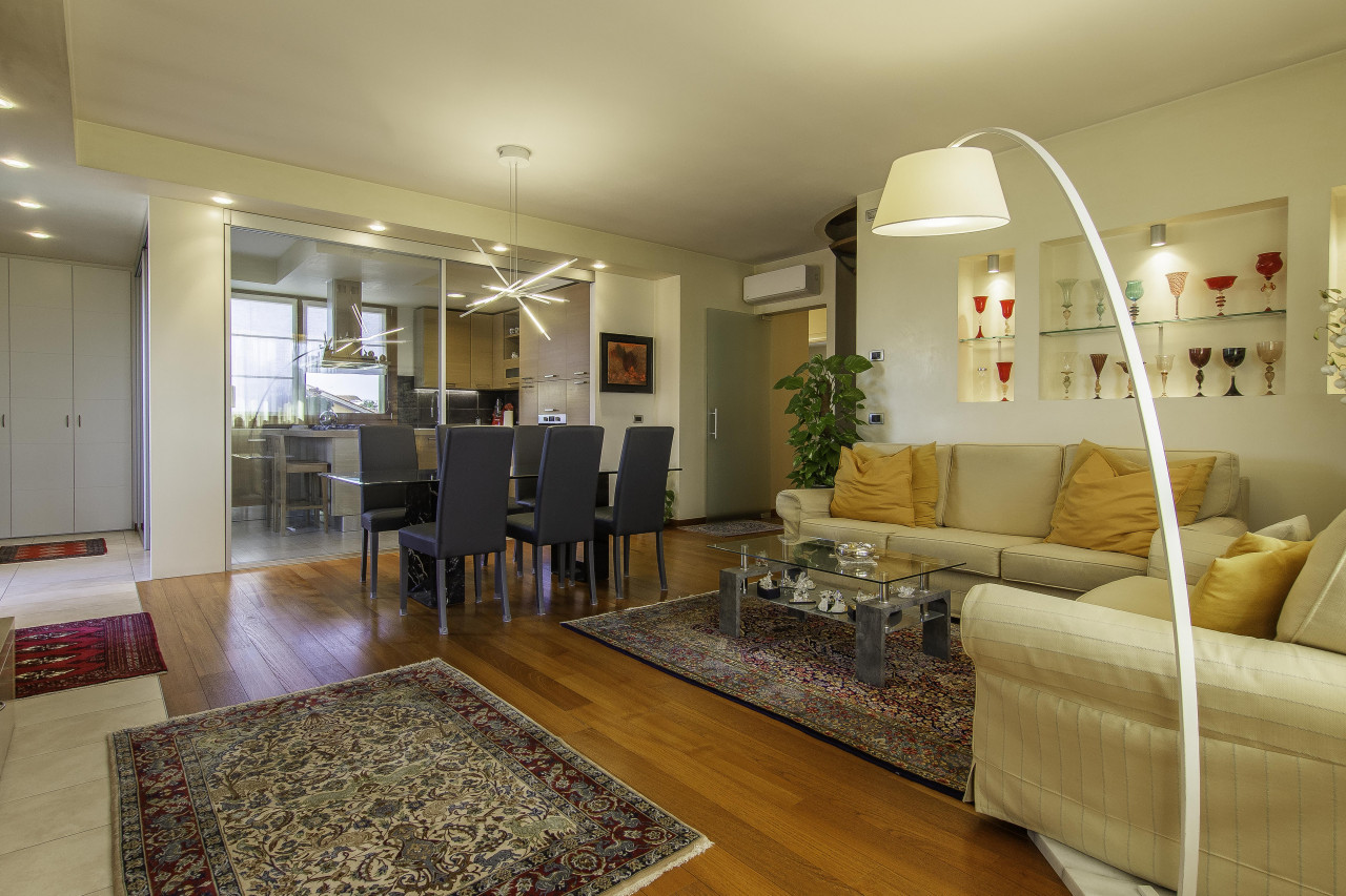 Finiture di pregio: pavimenti in legno e marmo naturale, porte interne laccate, serramenti in legno/alluminio ad alte prestazioni, illuminazione di design e dettagli artigianali di grande valore.