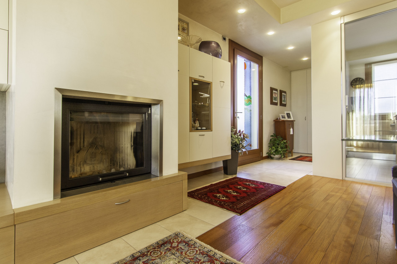 Ampia zona living open-space con camino di design e vetrate panoramiche che donano luminosità e continuità visiva con l’esterno.